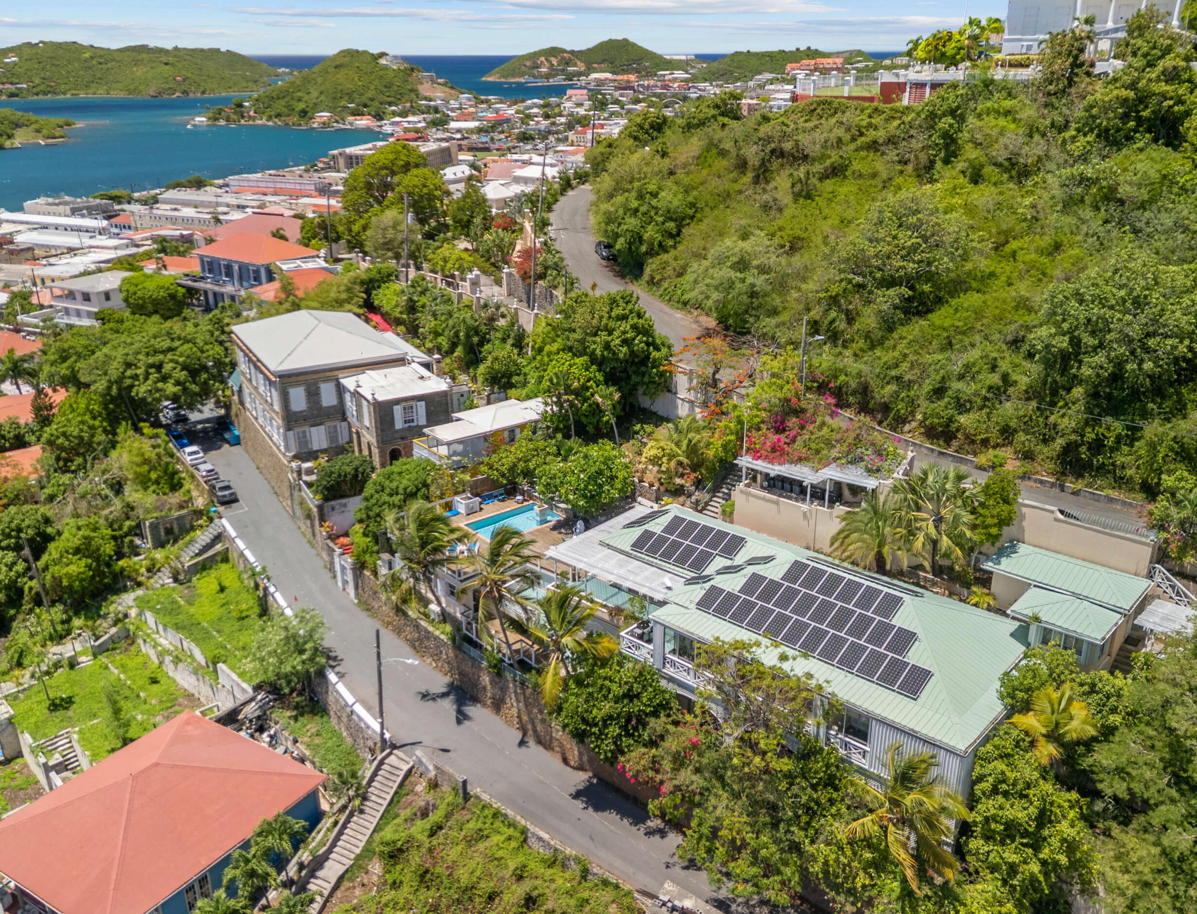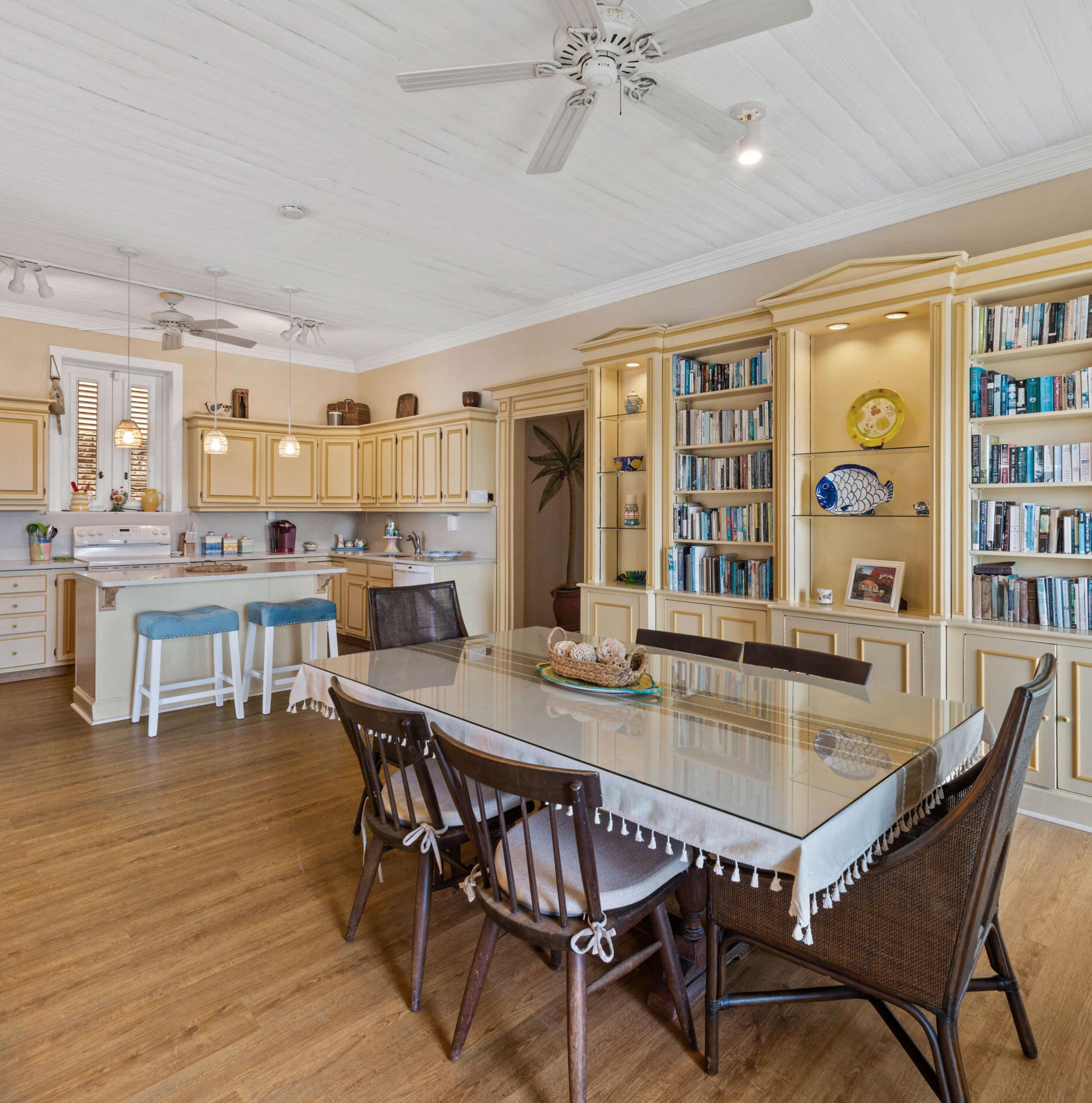 The main living level unfolds in an open arrangement of kitchen, dining, and lounge, framed by high ceilings and soft island tones.